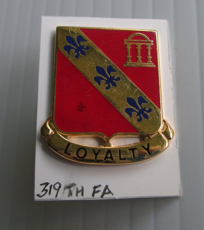 U.S. Army 319th Field Artillery DUI DI Insignia Pin. When I obtained it, it was attached to a small homemade cardboard square. Written on the cardboard it says "319th F.A.". That would have been written by a past owner.