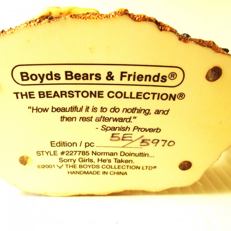 The Boyds Bears item with the style number 227785 is the "Bearstone" figurine titled" Norman Doinuttin...Sorry Girls, He's Taken.