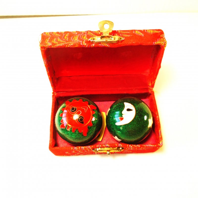 These balls are rolled in one hand to stimulate acupuncture points, which is believed to improve blood circulation, joint flexibility, and memory. The balls are hollow and contain chimes that produce calming sounds when rotated. I believe the balls are made of polished stone or a similar material. They have painted designs, one featuring a red sun motif and the other a face/moon motif.