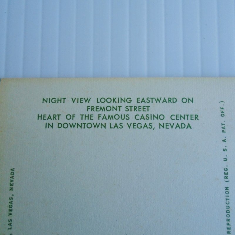 This postcard shows downtown Las Vegas at night time. Some of the hotel casinos pictured are The Mint, Hotel Fremont, Lucky Casino, California Club, and others. The card is not dated, but researching one of the hotel casinos, namely 'Lucky Casino', I found that it was in business from 1963 to 1967, so this card would have to be from that time frame.