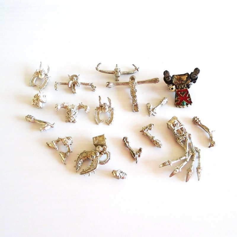 Of the items in this listing, I can tell that some are arms, chests, hands, heads with shoulders, claws, etc. Many of the items that are hands seem to be wielding various weapons. One of the pieces is partially painted.