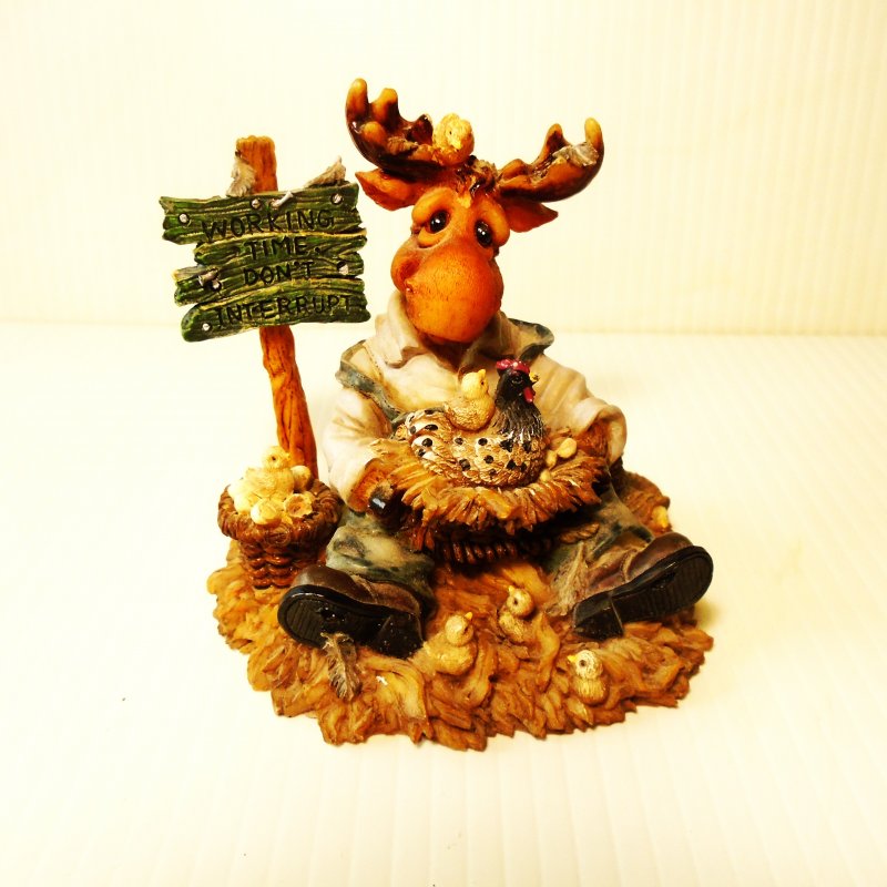 The figurine features a moose wearing blue bib overalls and a white shirt. He is holding a nest with a hen and a baby chick and has baby chicks all around him as well as one on his head. There is a sign to his right that says “Working Time, Don’t Interrupt”.
