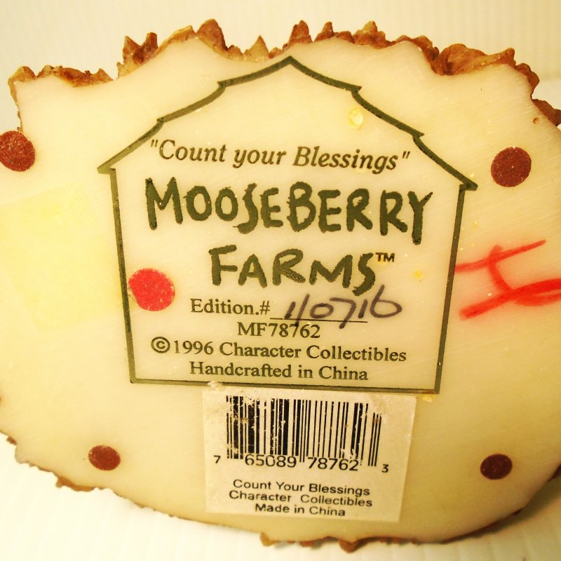 This is Mooseberry Farms Character Collectibles titled “Count your Blessings”. It is their item number MF78762 and is dated 1996. It is handcrafted, stands 4 inches tall, and is made of a resin material.