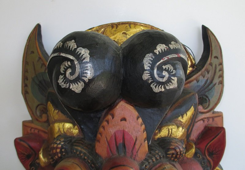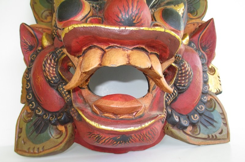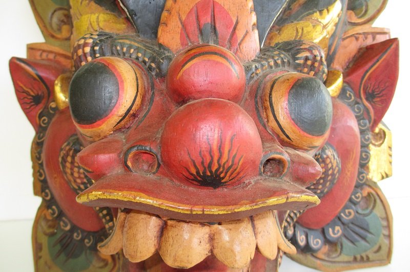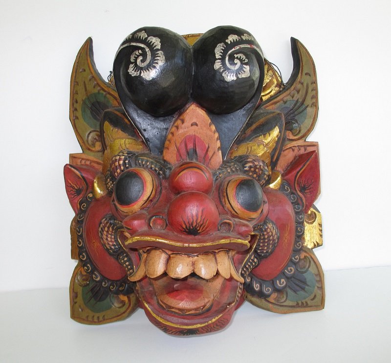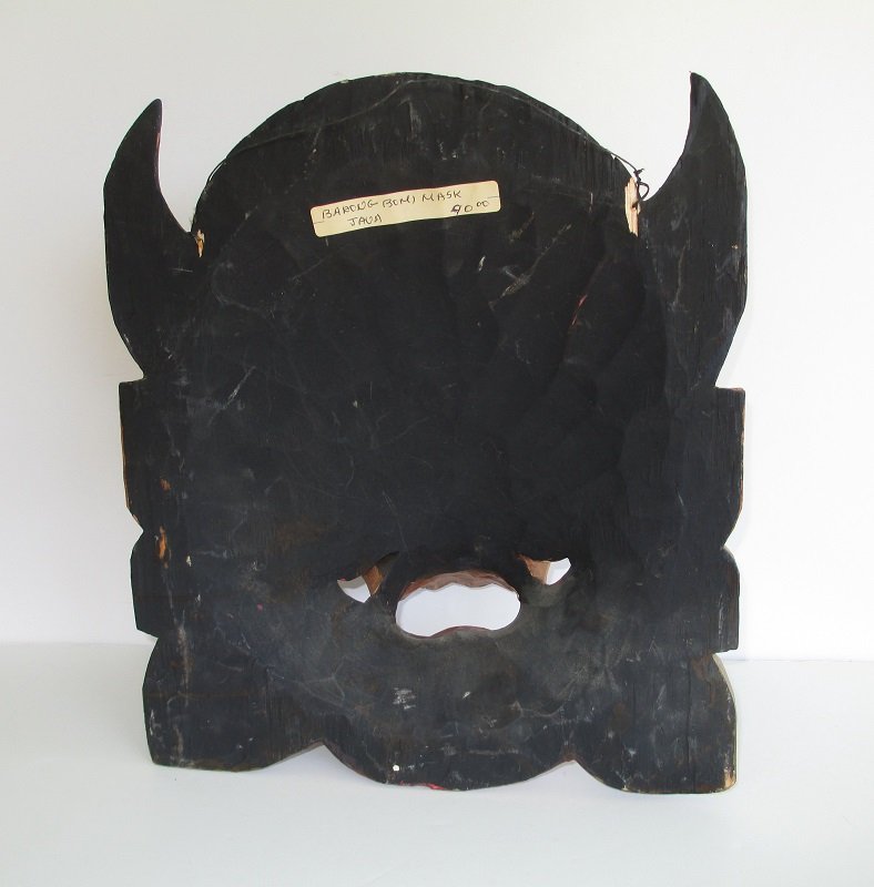 There is a label on the back that says Barong Bomi Mask, Java, 9000. I can find info on the internet about Barong Masks, but nothing related to the word Bomi, so possibly that is the name of who carved and painted it. There is also a wire on the back for hanging it on a wall.