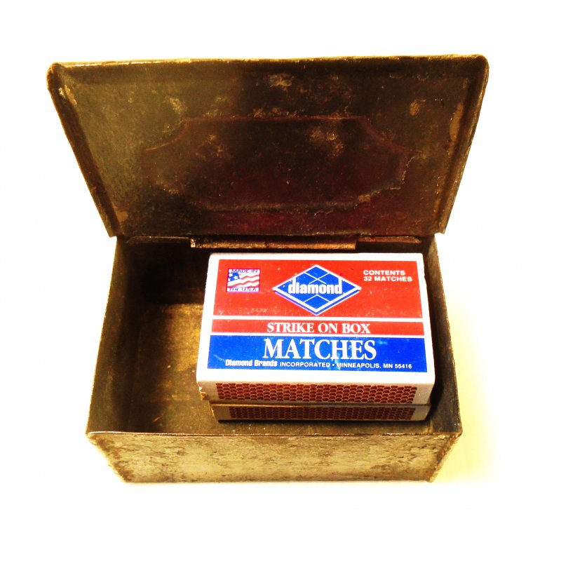 As you can see in my photos, there is a box for matches inside. The box is empty. I removed the matchsticks that were inside because it is highly illegal to mail any type of fire making materials.