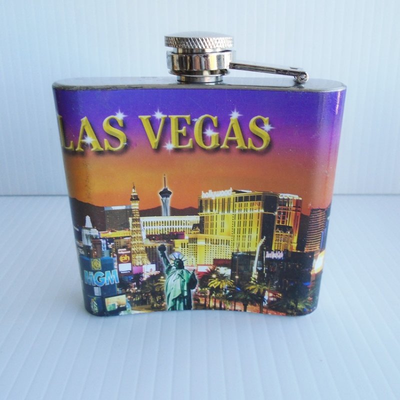 5 oz flask with the Welcome to Fabulous Las Vegas sign. The graphics show the world famous Las Vegas strip and features such hotels as MGM, Excalibur, New York New York, The Stratosphere, Planet Hollywood, and others.